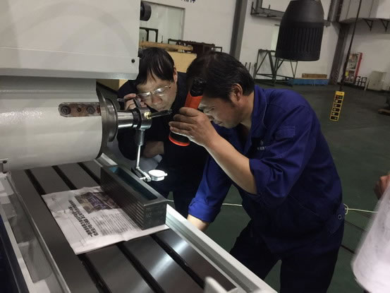 圖為專家在杭機股份現場抽查M7132H臥軸矩臺平面磨床的幾何精度