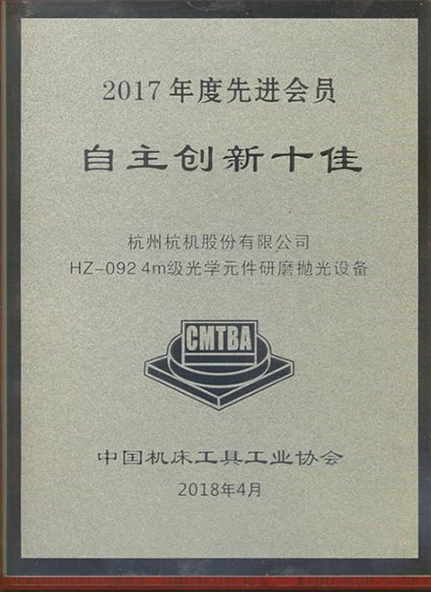 2018年4月,中國(guó)機(jī)床工具工業(yè)協(xié)會(huì)開(kāi)展了2017年度中國(guó)機(jī)床工具工業(yè)協(xié)會(huì)先進(jìn)會(huì)員(十佳)表彰活動(dòng),我公司憑借“HZ-092 4米級(jí)光學(xué)元件研磨拋光設(shè)備”項(xiàng)目榮獲2017年度中國(guó)機(jī)床工具工業(yè)協(xié)會(huì)“自主創(chuàng)新十佳”稱號(hào)。