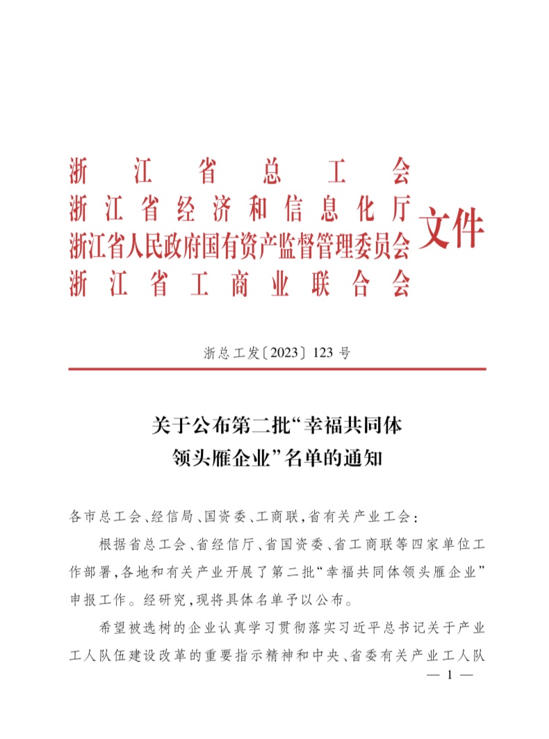 近日,根據(jù)省總工會(huì)、省經(jīng)信廳、省國資委、省工商聯(lián)等四家單位工作部署,各地和有關(guān)產(chǎn)業(yè)開展了第二批“幸福共同體 領(lǐng)頭雁企業(yè)”申報(bào)工作。我司 “浙江杭機(jī)股份有限公司”入選“幸福共同體 領(lǐng)頭雁企業(yè)”。